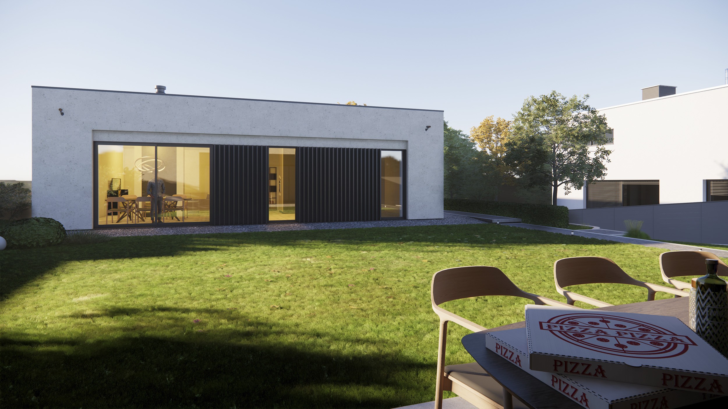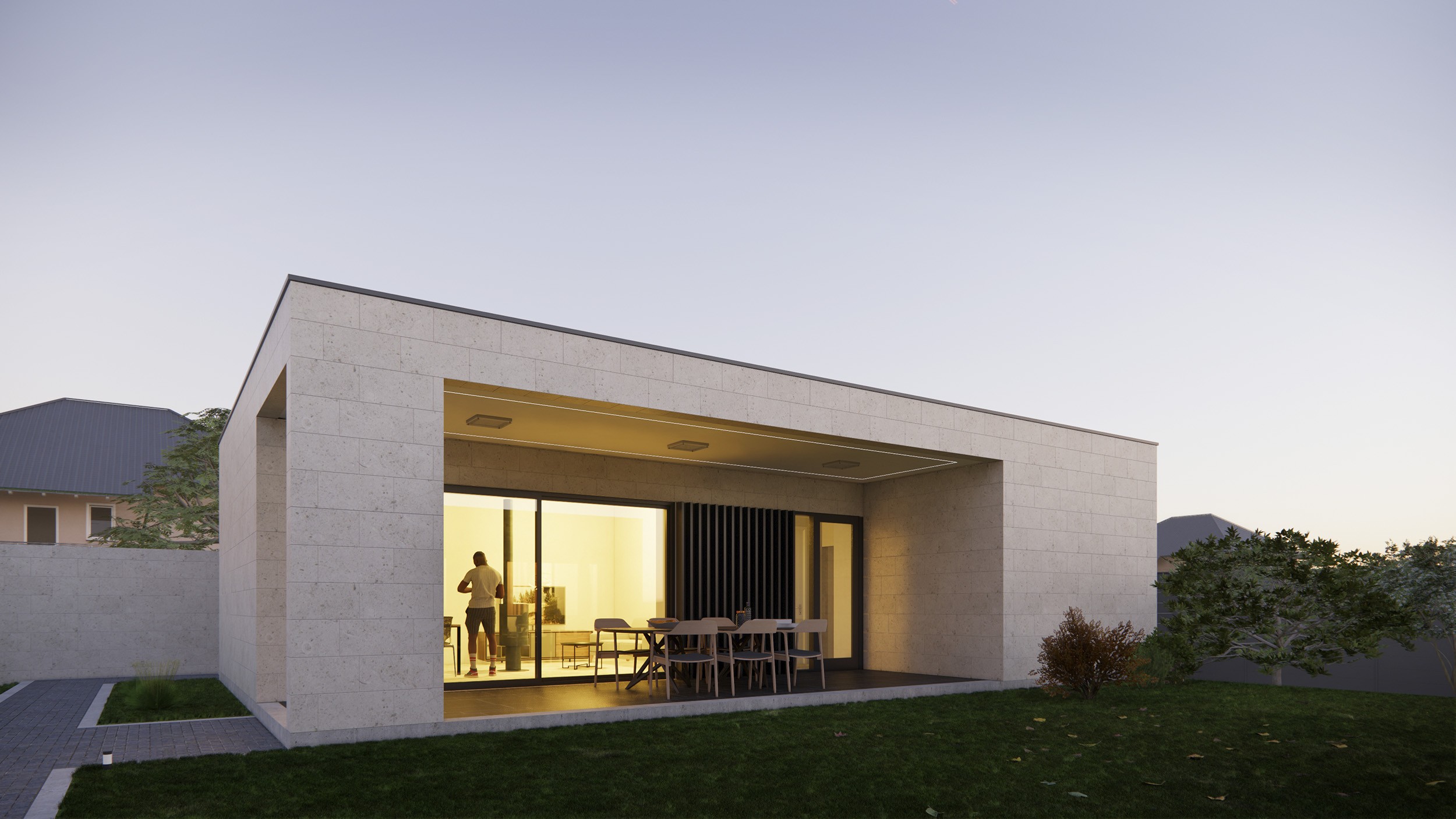 Охайний будинок в Черкасах має загальну площу 270 м2. Будинок вийшов дуже тактильний і приємний, оздоблений натуральним каменем і декорований алюмінієвими ламелями. Основна частина будинку спланована в одному рівні. Гараж на 2 авто і технічні приміщення сховані у підвалі. Сауна такої ж ширини, як і будинок, разом формують внутрішній дворик (достатньо просторий для комфортного відпочинку).