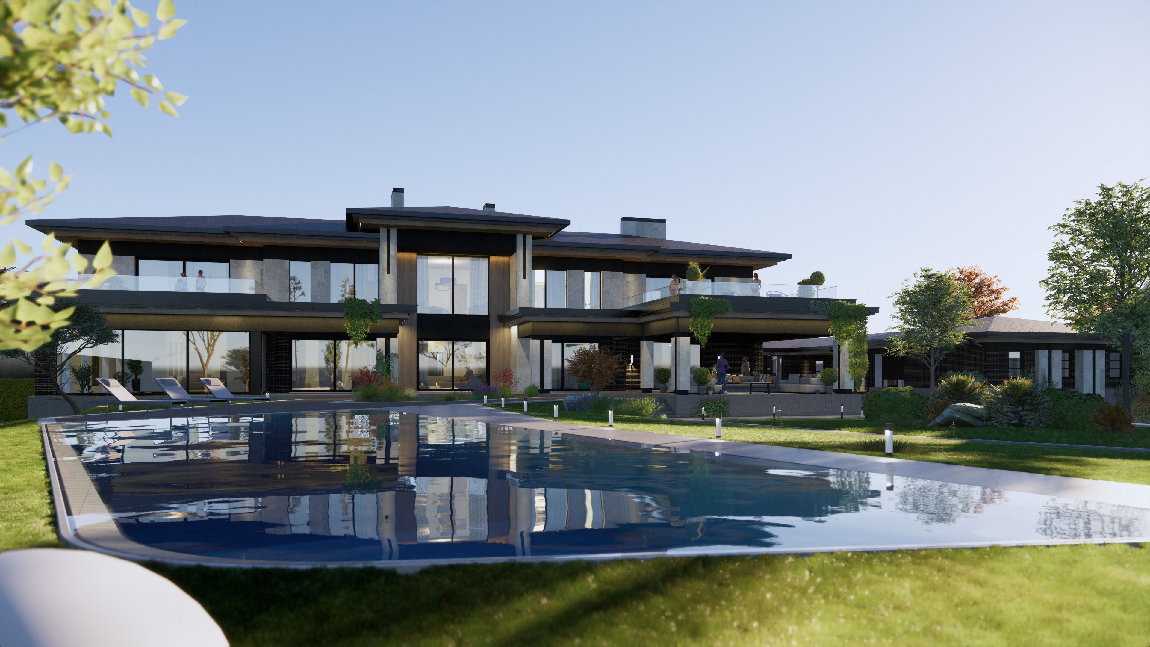 • Основний будинок із 4 спальнями, просторими гардеробними, ванними кімнатами, кабінетом, студією, основною та допоміжною кухнями.