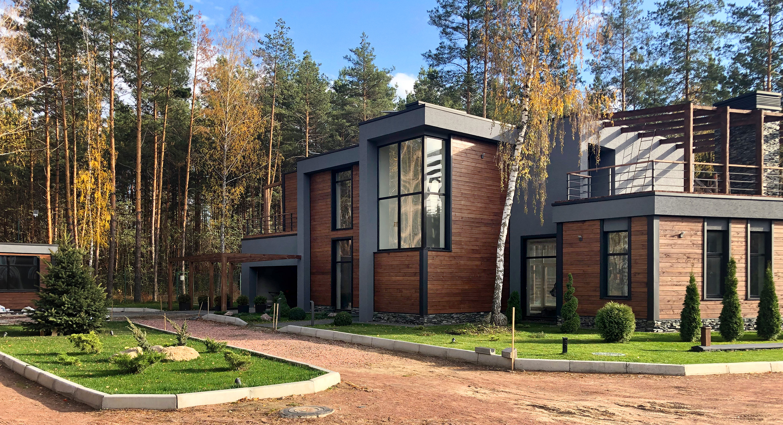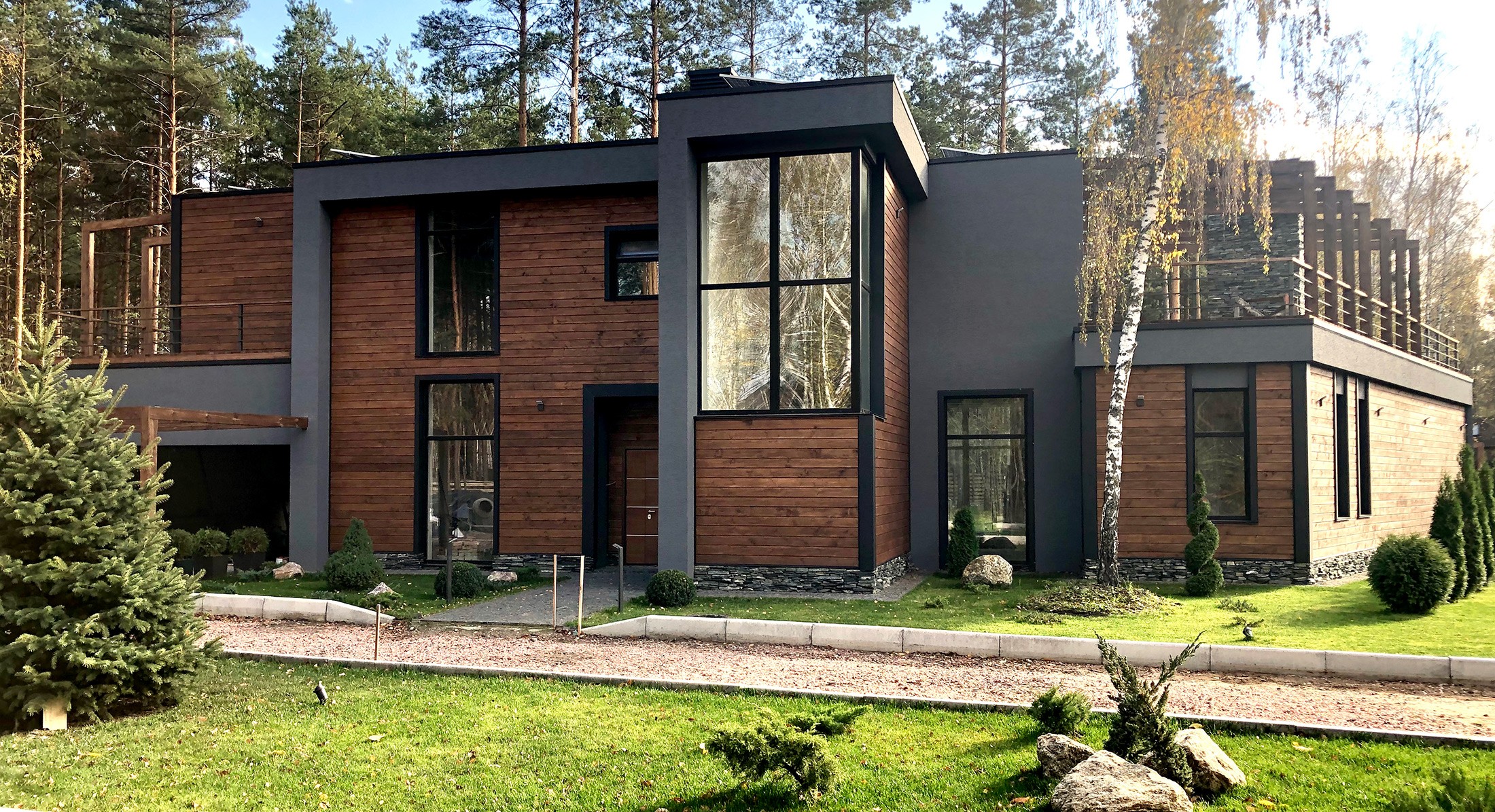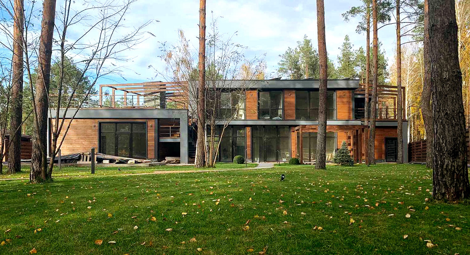 Вилла расположена на двух пологих участках в живописном сосновом лесу под Вышгородом в Киевской области. Одним из ключевых пожеланий клиента было сохранение имеющихся на участке зеленых насаждений, поэтому архитектурное решение дома и благоустройство территории соподчинены сложившемуся окружению. Стилистика здания определена любовью заказчика к современным архитектурным и инженерным тенденциям. Большая площадь остекления объединяет внутреннее пространство дома с окружающей живописной средой, а деревянная облицовка фасадов интегрирует и растворяет архитектурны й объем в естественной среде. Изюминкой виллы рекреационный блок, состоящий из внутреннего и наружного бассейнов, сауны, хаммама и джакузи, расположенной на террасе второго этажа, при спальне хозяев дома. В результате получился светлый и просторный дом, в котором приятно и комфортно жить.