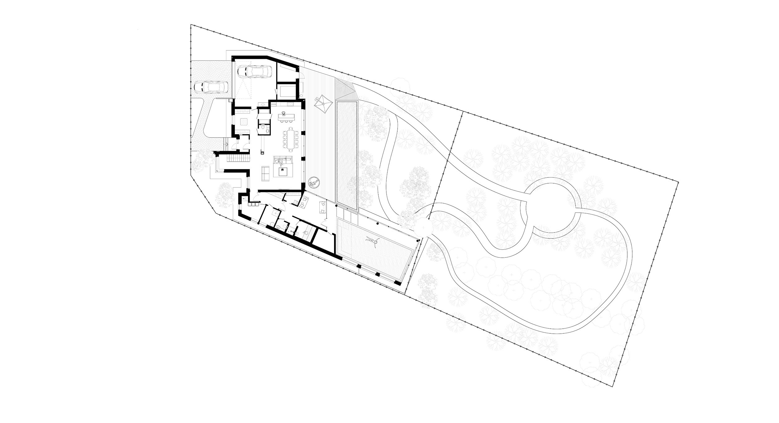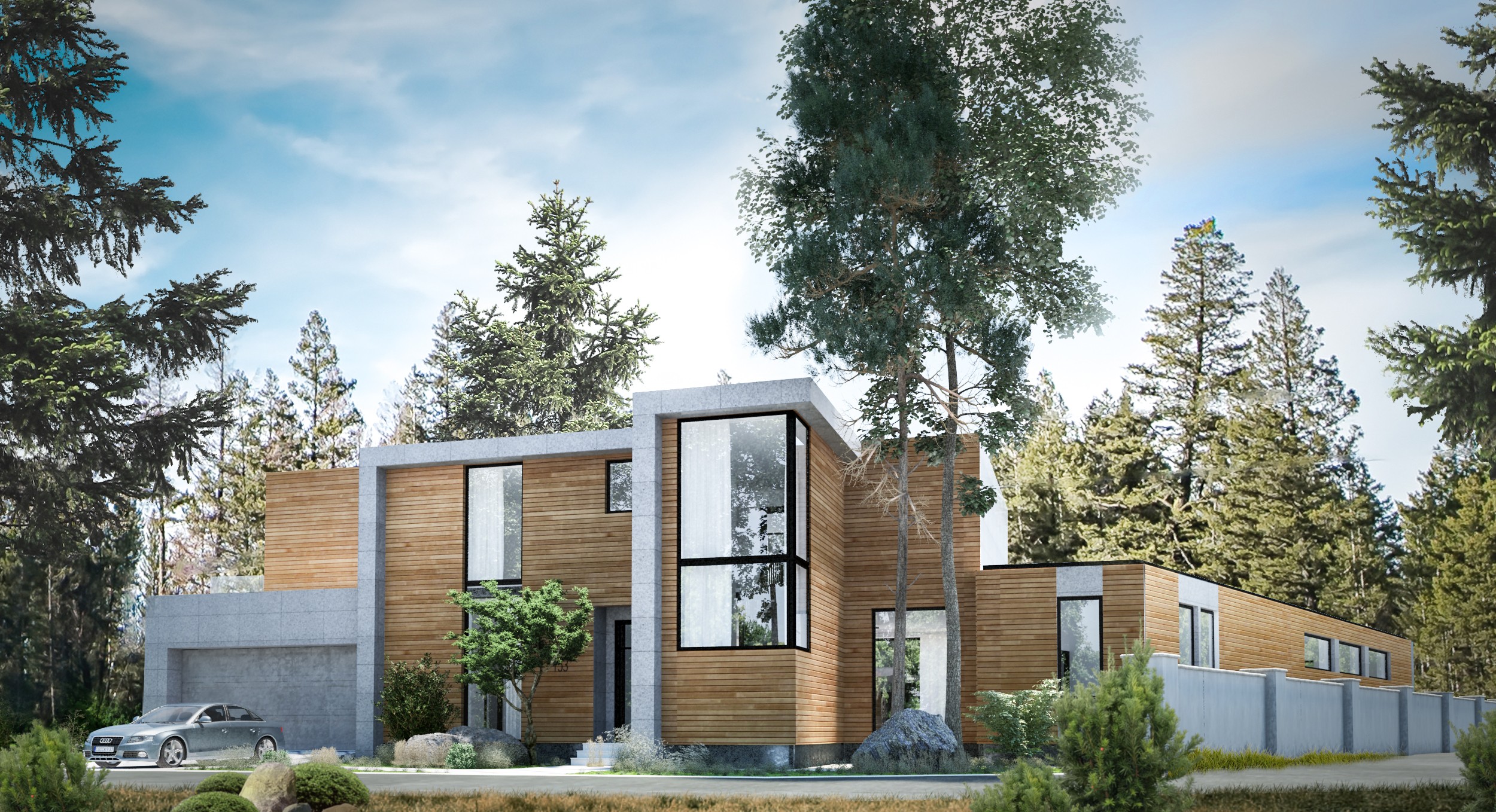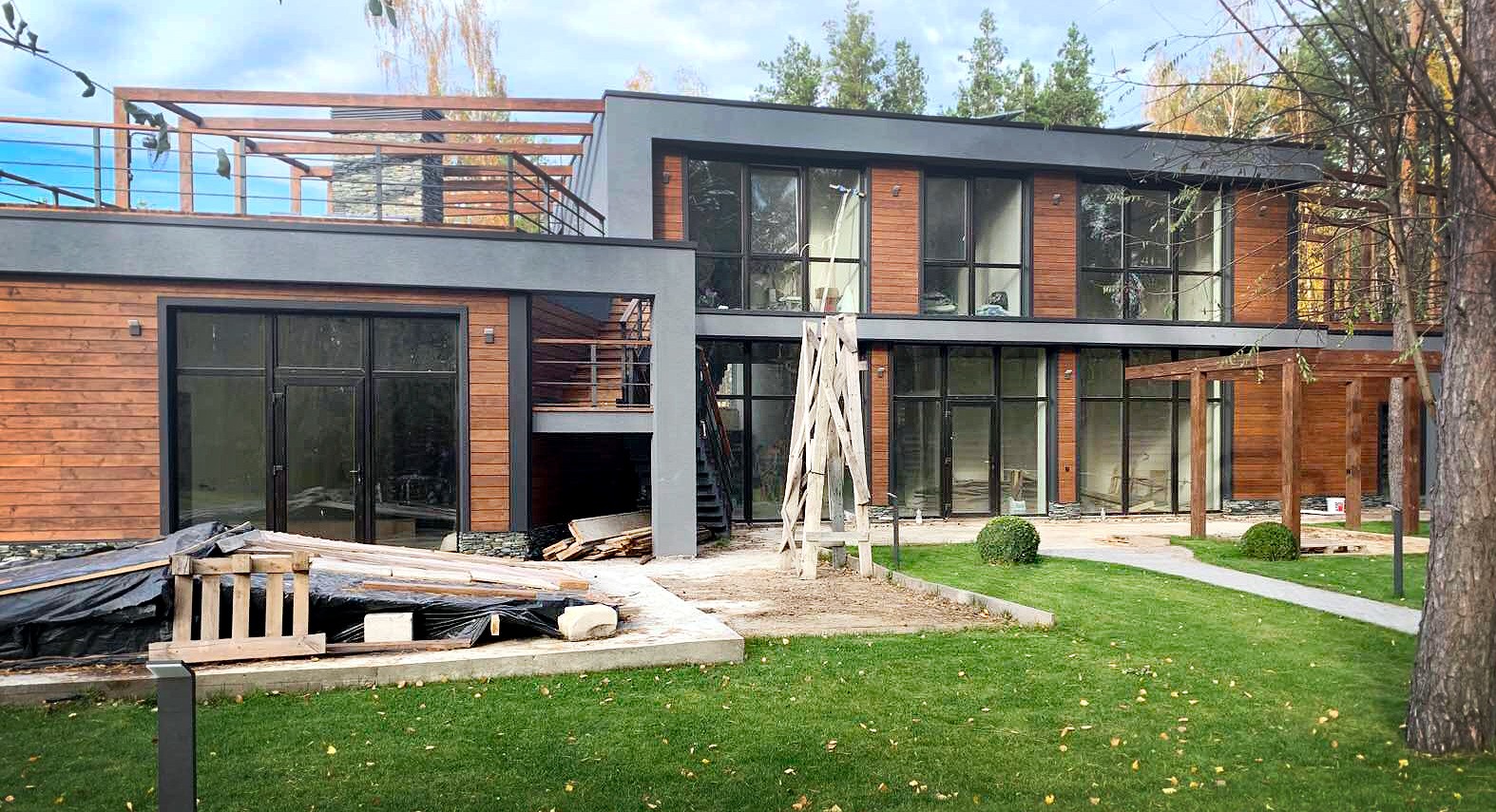 Вилла расположена на двух пологих участках в живописном сосновом лесу под Вышгородом в Киевской области. Одним из ключевых пожеланий клиента было сохранение имеющихся на участке зеленых насаждений, поэтому архитектурное решение дома и благоустройство территории соподчинены сложившемуся окружению. Стилистика здания определена любовью заказчика к современным архитектурным и инженерным тенденциям. Большая площадь остекления объединяет внутреннее пространство дома с окружающей живописной средой, а деревянная облицовка фасадов интегрирует и растворяет архитектурны й объем в естественной среде. Изюминкой виллы рекреационный блок, состоящий из внутреннего и наружного бассейнов, сауны, хаммама и джакузи, расположенной на террасе второго этажа, при спальне хозяев дома. В результате получился светлый и просторный дом, в котором приятно и комфортно жить.