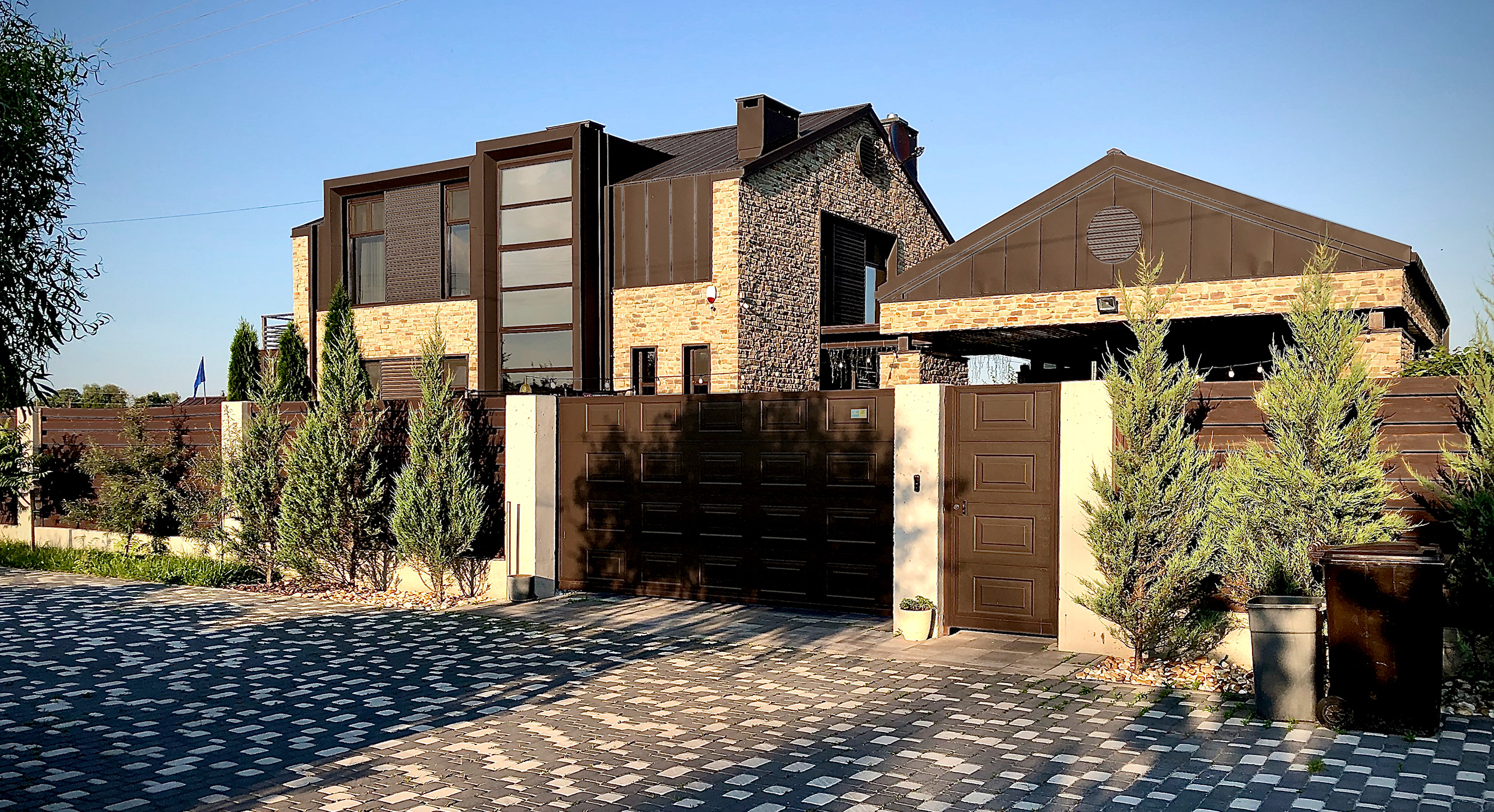 В 20 минутах езды от центра Киева, на берегу озера находится компактный уютный дом, общей площадью 180 м2. Коттедж расположен на окраине села и задним фасадом ориентирован на восток. Со второго этажа открываются красивые полевые пейзажи особенно в ранним утром. Каминный зал, ориентированный на озеро, плавно перетекает в столовую и кухню. Пространство комнат увеличивают высокие оконные проемы, объединяя внутреннее и внешнее окружение. Для оптимизации микроклимата в помещениях выполнен теплотехнический расчет на сопротивление теплопередаче и влагопоглощению конструктивных элементов ограждающих конструкций, а при строительстве использовались только сертифицированные экологически чистые материалы: базальтовый утеплитель, титанированый метал, натуральный камень. Такая комбинация позволяет сочетать современные тенденции в архитектуре дома и уют каменного этноса. Что может быть прекрасней, чем после тяжелого рабочего дня и городской суеты, приехать в свой дом и раствориться в природе. Свежий воздух, красивая панорама со второго этажа. Только здесь, по-настоящему можно оценить домашний уют. Это мир наполненный живой природой и необыкновенными красками.