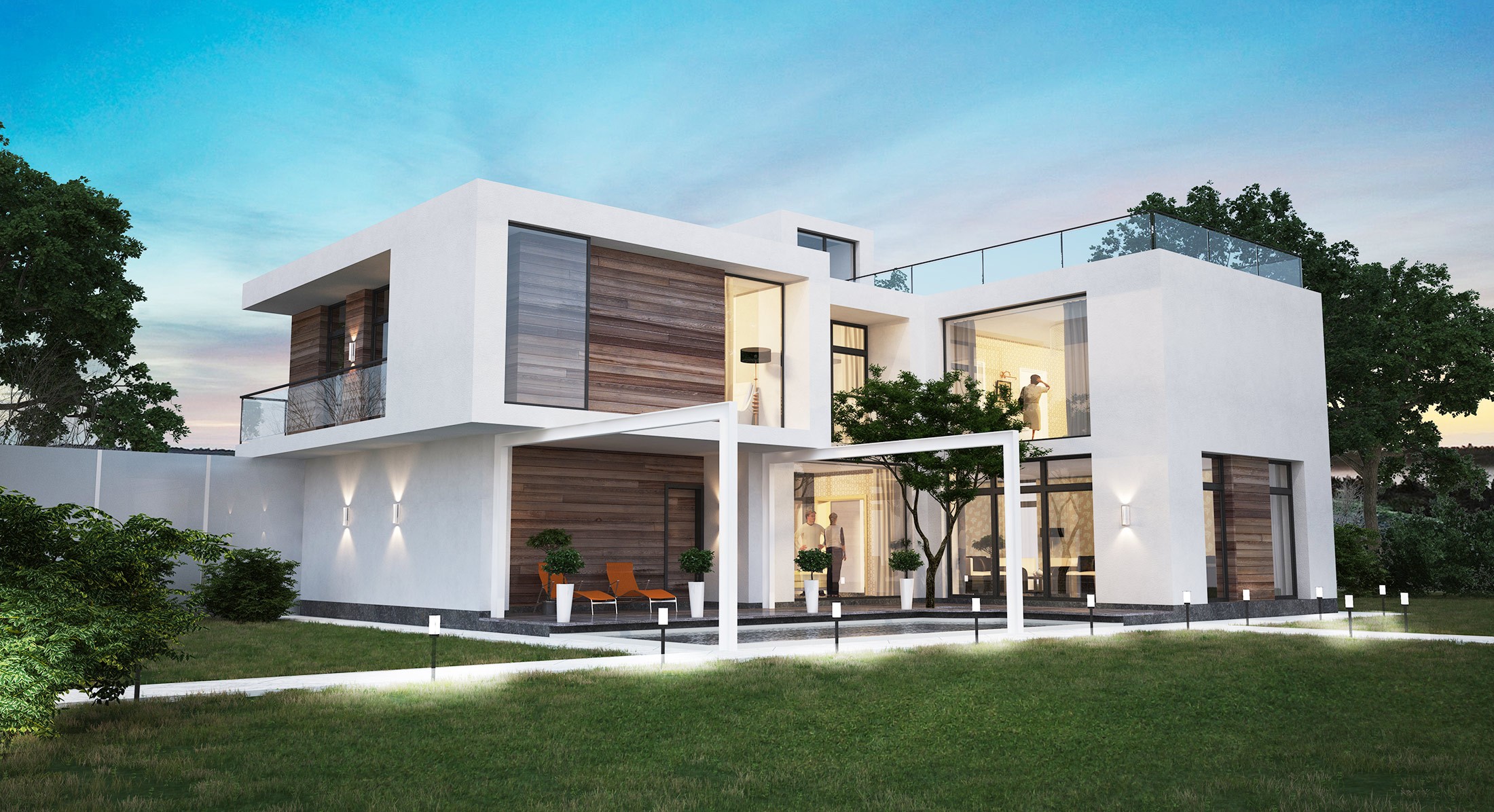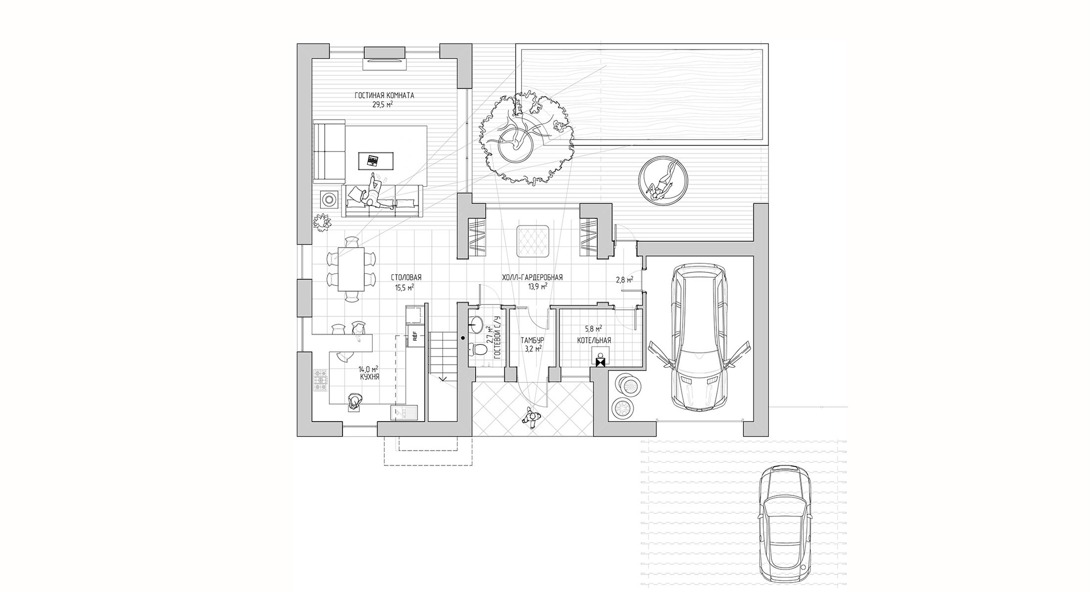 Современный, лаконичный и удобный коттедж, запроектирован под девизом: «Все необходимое, ничего лишнего!». При небольших площадях домов приходится выбирать между максимизацией жилой площади и комфортом. В данном случае приоритет был поставлен на комфорт и эстетику. Проект отличается особой связью внешнего и внутреннего пространств, объединяя их, архитектор компенсирует замкнутость интерьера пространством благоустроенного внутреннего двора. В этом проекте отсутствуют случайности, все транзиты просчитаны и посажены на незримые оси визуального восприятия, каждую из которых определяют грамотно расположенные акценты, будь то дерево или световой проем. Первый этаж состоит из просторного холла-гардероба с видом на бассейн, который комфортно объединяет зону студии и бытовую зону с гаражом. Студия представляет собой пространство, состоящее из кухни, столовой и гостиной. Второй этаж это в первую очередь, просторная мастер спальня со своим гардеробом и ванной комнатой. Из спальни открывается замечательный вид на патио, однако имеется возможность переноса окна на задний фасад, открывая вид на задний двор. Холл второго этажа с современным минималистическим камином объединяет мастер-спальню с двумя детскими, а также ванной общего пользования и гардеробной комнатой. Такая связь исключает появление ненужных коридоров. Экстерьер выполнен в передовых тенденциях минималистических домов. Строгие фасады смягчены теплом дерева, локально используемого для отделки. Незначительные консоли второго этажа наравне с декоративной металлической конструкцией формируют неординарность объемно-пространственного решения. Данный коттедж без сомнения можно назвать образцом дома в стиле минимализм.