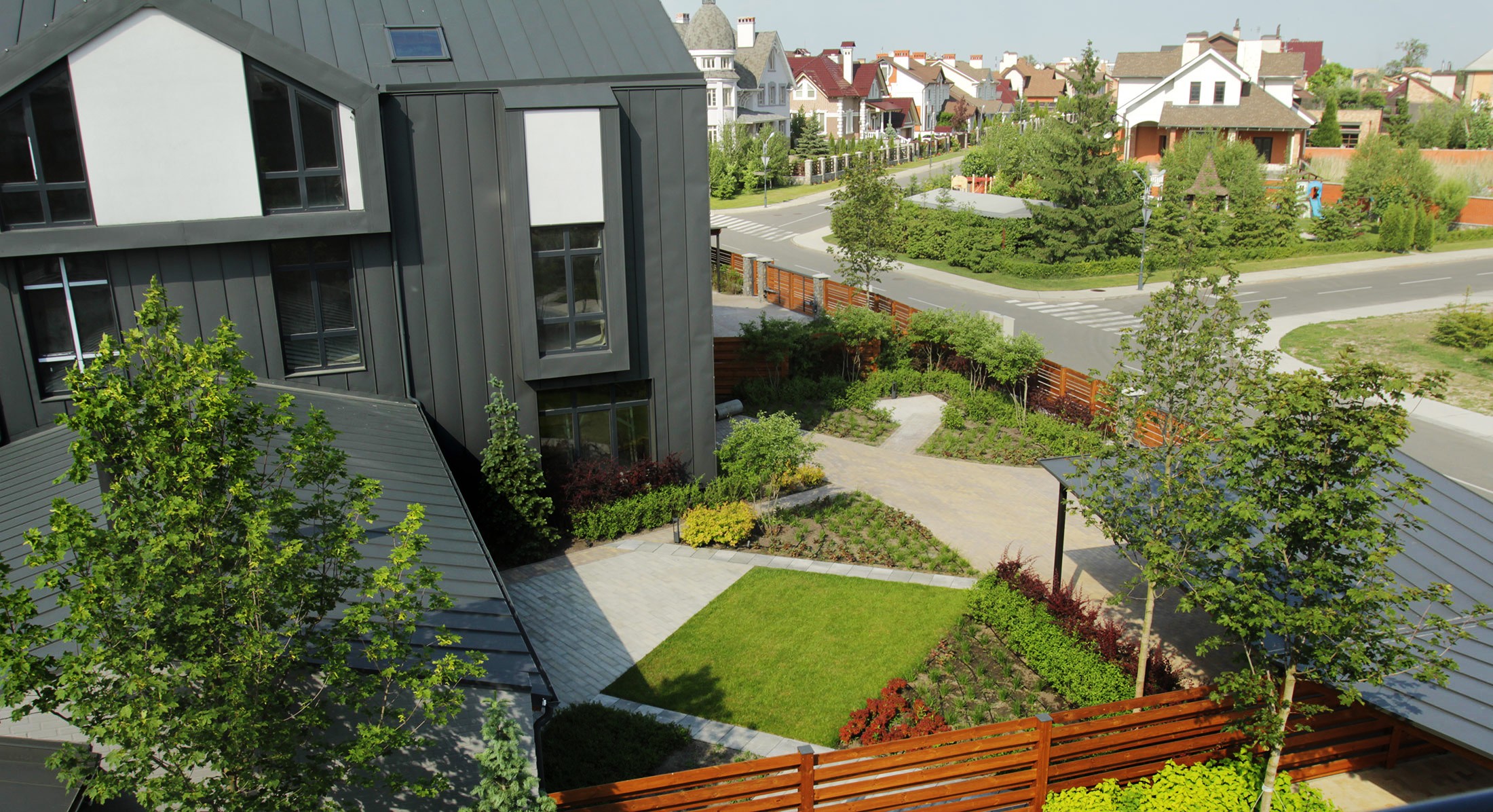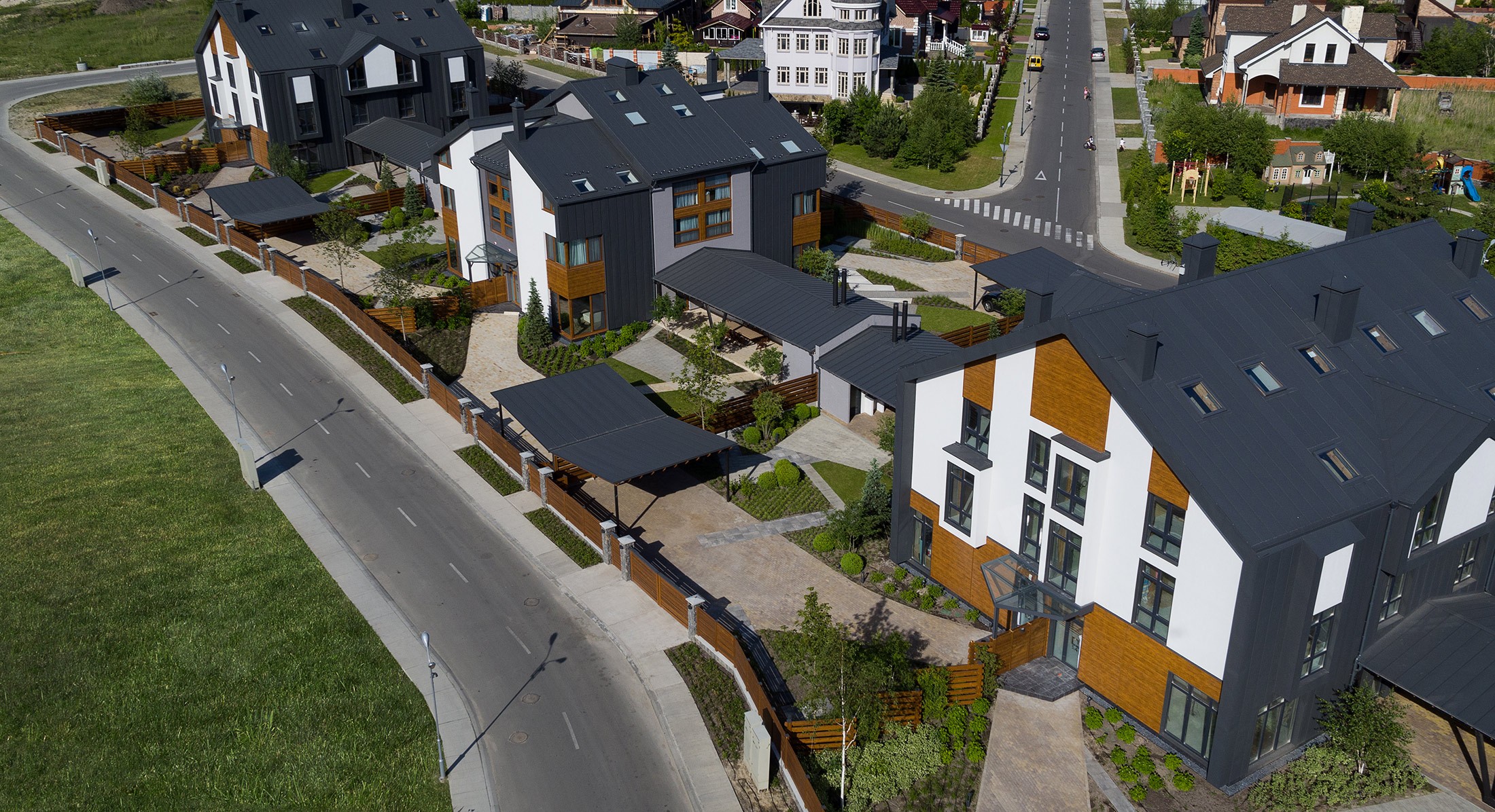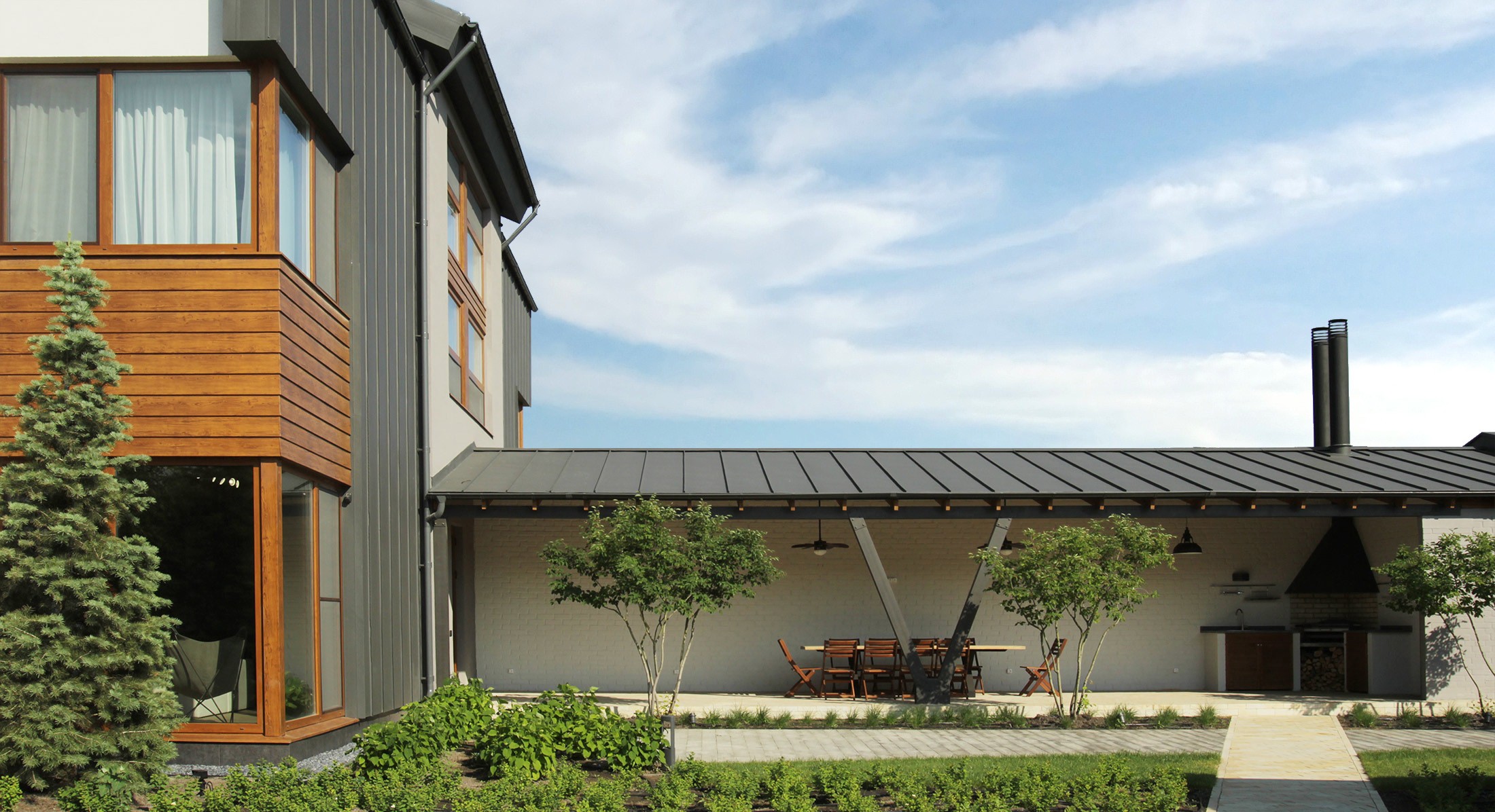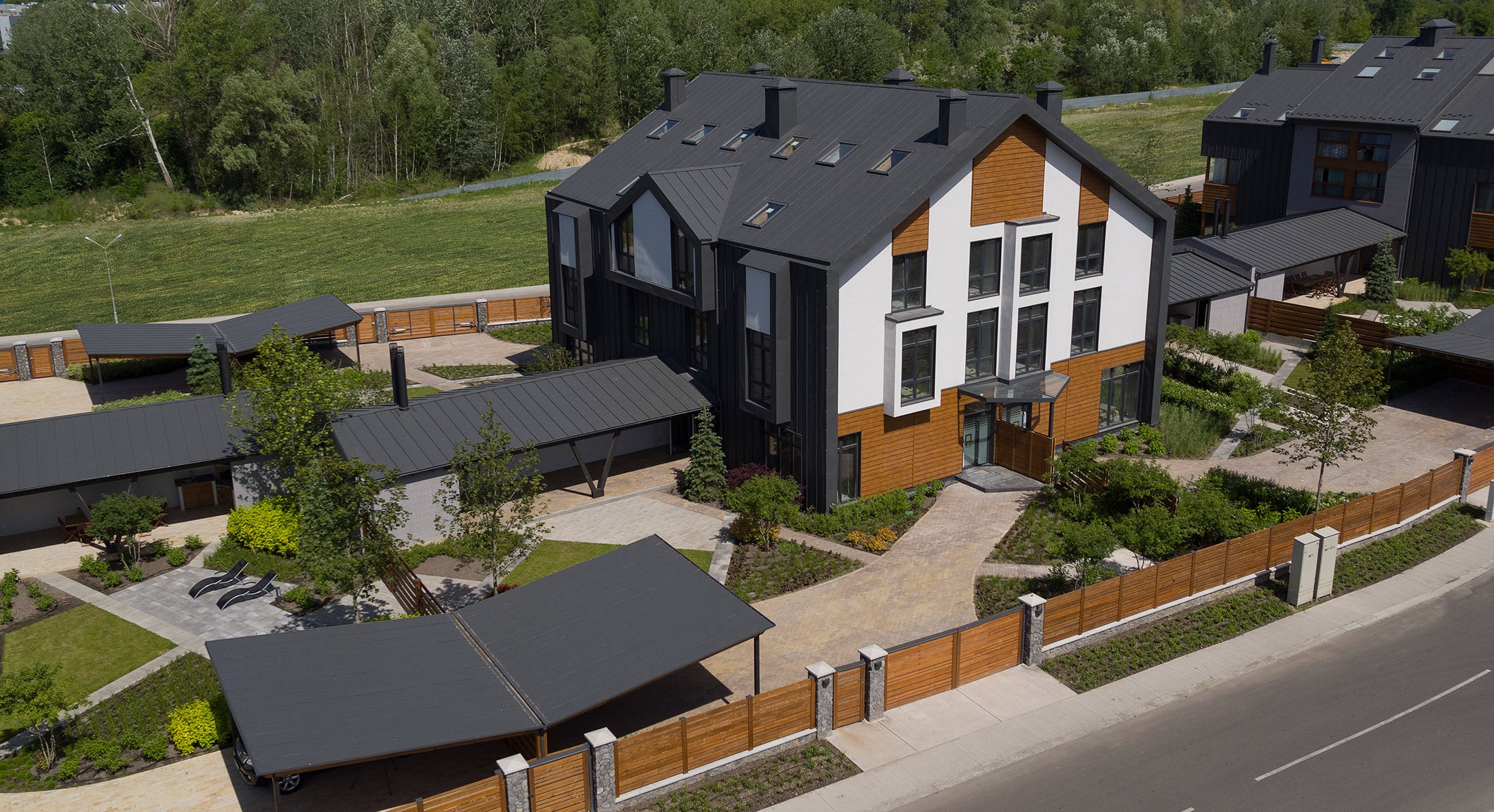 В ходе проектирования, было рассмотрены различные варианты кровельных покрытий и отделочных материалов для фасада. Заказчик одобрил комбинацию оцинкованной стали и минеральной паропроницаемой штукатурки. Мы предложили несколько вариантов фасадов с этими материалами и оптимизировали поэтажные планы. В результате получили интересный комплекс из четырех современных домов и 16 автономных квартир. Каждая квартира имеет прилегающую благоустроенную территорию 500 м2 с крытой парковкой на 2 автомобиля и просторной террасой с зоной барбекю.
