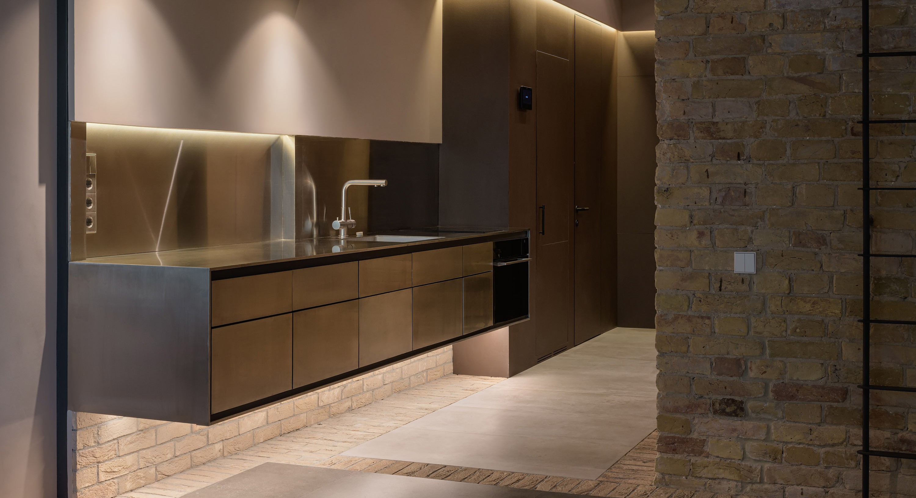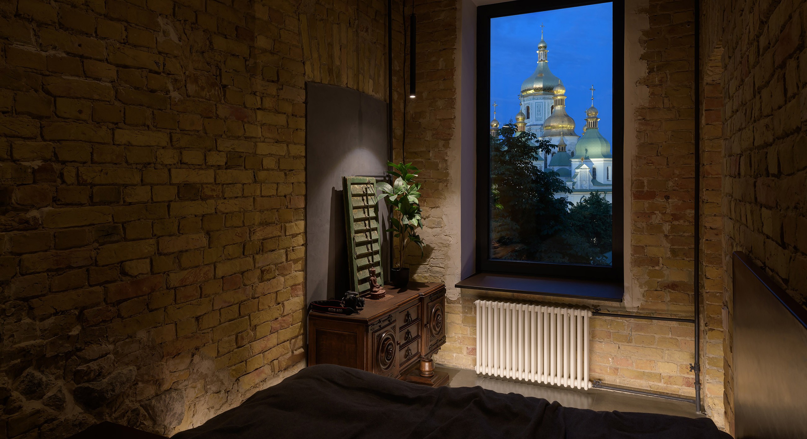 Зазвичай проект виражає ідею авторів, однак цей проект виражає філософію та стиль життя. Сприйняття обʼєкту починається з оточення, затишних вуличок стародавнього міста з півтора тисячолітньою історією. Всюди відчувається певний магнетизм, що приваблює людей з усього міста. Це дуже комфортне місце для життя - тут є все необхідне: чудова транспортна розвʼязка, інфраструктура, великі паркові зони де можна зробити пробіжку вранці і зустріти захід сонця. Ми зробили акцент на надійності елементів, простоті естетики і функціональності. А найголовніше: на шані історії міста, його душі і гармонії! Вперше потрапивши до квартири, незважаючи на жахливий стан, відчувалася її позитивна енергетика та потенціал. Це була маленька квартира що складалася із компактної ванної кімнати, спальні та кухні відокремлених товстою несучою стіною. Та мала дві суттєвих переваги: висоту приміщення 3.9 метри та шикарний вид з вікон. Функціональна задача була доволі прагматичною: розмістити в тій самій площі відокремлену спальну кімнату, студію, кухню та ще одне спальне місце. Відкривши автентичні конструкції та матеріали будинку, збудованого у 1912 році, ми вирішили лишити їх без змін, тому ви не побачите пропилів в стінах чи зовнішньої електропроводки. Лишили навіть камені сходів, відбитих під час радянського перепланування. До плюсів слід віднести бетонні перекриття, що є значною рідкістю для будинків того часу. В меншій кімнаті ми розмістили спальню. Її ширина 2.2 метри лімітувала розміщення елементів. Тому для доступу до гардеробу ми розробили ліжко-подіум обтягнуте натуральною шкірою, що робить його неймовірно тактильним. Висота ліжка дуже зручна і функціональна. Коли ви прокидаєтесь вранці у вас є можливість бачити неймовірний схід сонця над абрисом величної Софії. Теплу кольорову гамму кімнати доповнює стародавній голландський комод 1923 року. Більшу кімнату було обʼєднано з коридором щоб розкрити простір та організувати візуальний контакт одразу від входу в квартиру. Дуже важливим аспектом була надійність і довговічність всіх елементів. Тому типові рішення було замінено індивідуальними розробками. Консольна прохідна кухня і ліжко-антресоль реалізовані по металевим каркасам що здатні витримувати великі навантаження. Нержавіюча харчова сталь робить кухню надійною, практичною та чистою, тому що видно на ній кожну крихту) Для того щоб збільшити робочу поверхню кухні ми сховали холодильник в простір ванної кімнати і зашили композитними HPL панелями з фактурою шкіри антилопи як і всю вхідну зону. Під час демонтажу ми були приємно здивовані коли знайшли кілька ніш прихованих в старих стінах. Таким чином в нас зʼявився міні бар і книжна поличка) Замість класичної TV зони ми передбачили проекційну поверхню з діагоналлю 165 дюймів та якісний саундбар, що перетворюють студію на домашній кінотеатр. Ми не ставили двері між студією і спальною кімнатою підкресливши єдність та взаємодію простору і мешканців квартири. Не зважаючи на багатофункціональність студія виглядає просторою та затишною. Дуже допомагає цьому озеленення навколо балкону, що створює ефект приватності та захищає від сонця влітку.