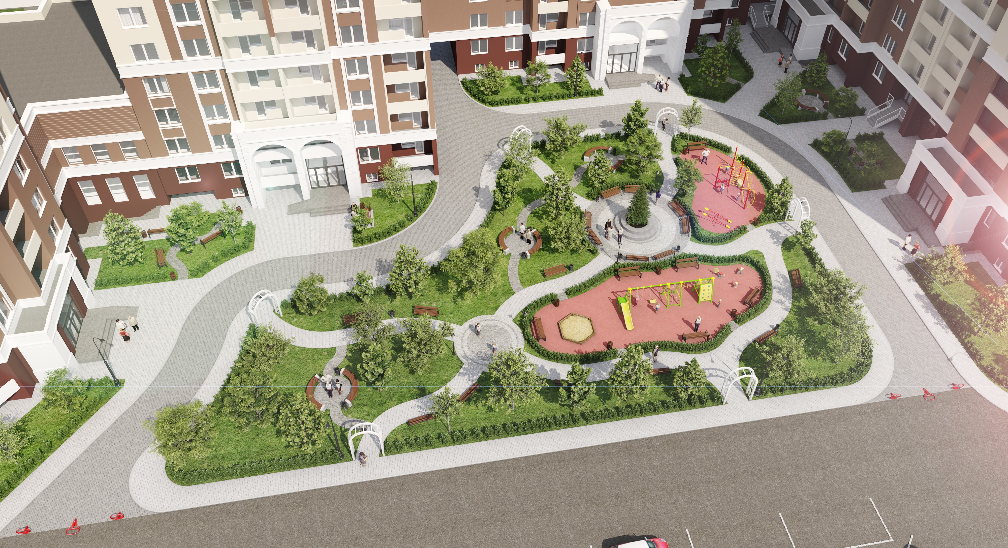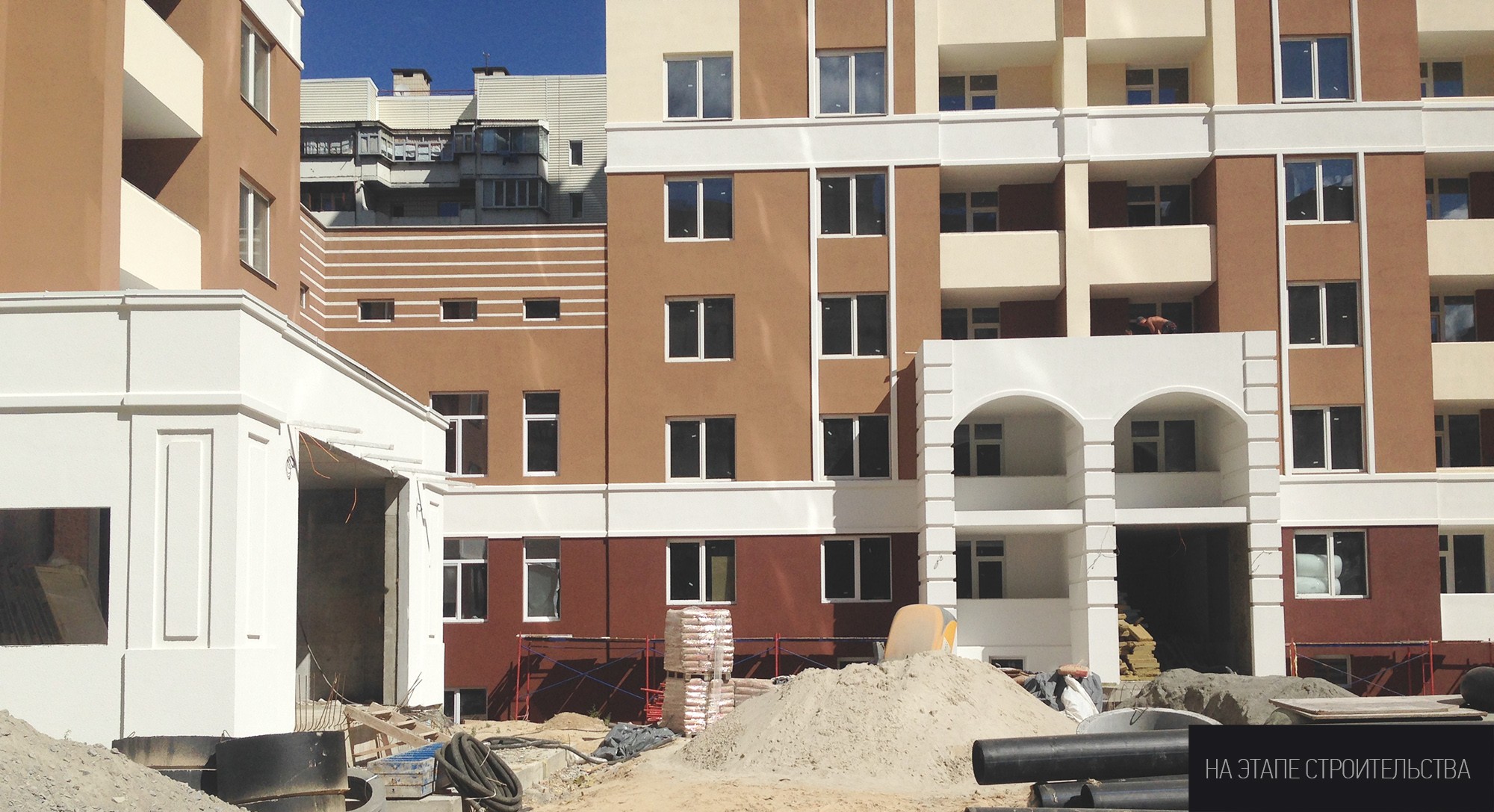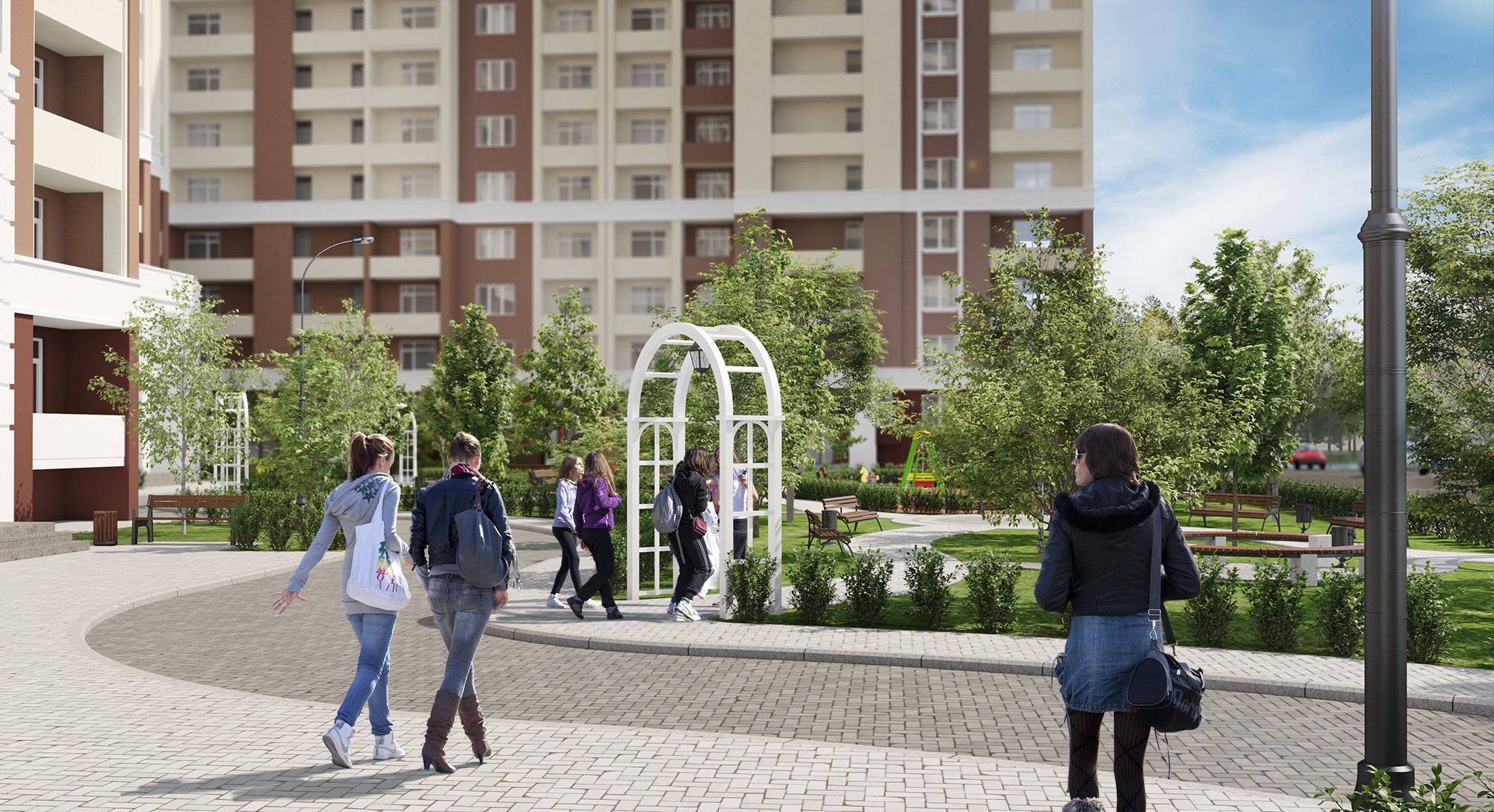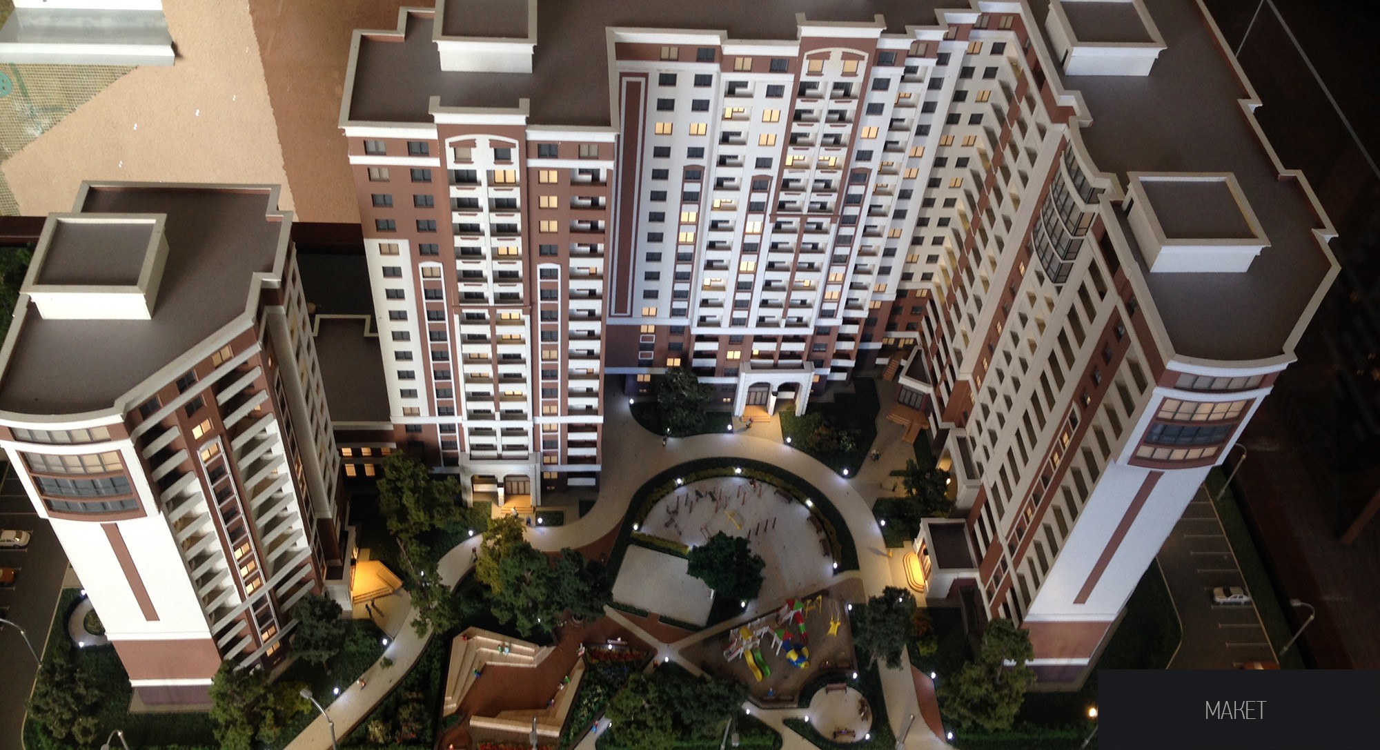 Застройщик имел на руках рабочий проект, который не устраивал его ни с эстетической, ни с функциональной точки зрения. Мы провели адаптацию проекта, заново решив организацию генерального плана участка и эстетический облик комплекса. Небольшую корректировку претерпели и сами квартиры, на трех последних этажах торцевых секций мы организовали витражное остекление, открыв вид на городской пейзаж в сторону Киева. Проект объекта общей площадью 40 000 м2 был разработан в течении двух месяцев. Клиент остался доволен качеством документации и соблюдением сроков.